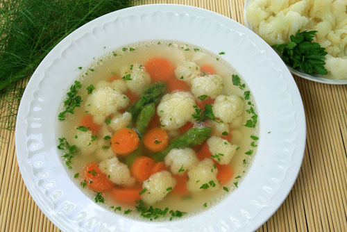 Все, что вам понадобится, это: цветная капуста, лук, масло, сметана, яйцо и зелень. Суп очень прост в приготовлении. Вам нужно всего лишь сварить цветную капусту, добавить в получившийся бульон поджаренный лук, вареное яйцо и заправить все это сметаной. По желанию можно добавить зелень. Этот суп содержит очень мало калорий, а клетчатка, которая в большом количестве содержится в цветной капусте, непременно поможет дамам побороть лишние килограммы.